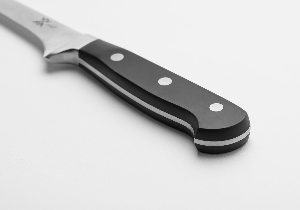 Die Messer sind durch die erfolgte Verdichtung sehr scharfe und langlebige Handwerkzeuge für jeden Koch. Die Klinge besteht aus rostfreiem und säurebeständigem Chrom-Molybdän Edelstahl, der auf 56 HRC gehärtet ist. Die Kunststoff Heftschalen sind passgenau im Spritzgussverfahren angespritzt und dadurch hygienisch optimiert. Die Messer sind für die Spülmaschine geeignet. Dennoch empfehlen wir, die Messer per Hand zu reinigen. Die Ergonomie und die Form sind klassisch. Drei Edelstahlnieten geben den Heftschalen zusätzlich extra Halt und eine besondere Optik. Die Klinge ist sehr scharf abgezogen und mit großer Vorsicht zu behandeln.