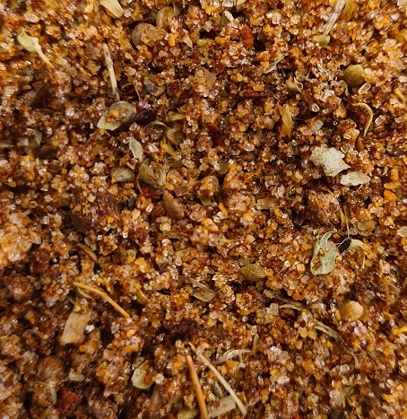 Rübenzucker,Gewürze (Paprika, KNoblauch, Chiliflocken, Oregano, Pfeffer, Koriander, Kreuzkümmel), Steinsalz, getrocknete Speisewürze