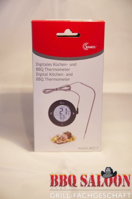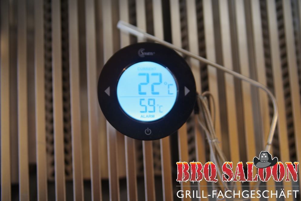 Mit dem BBQ Saloon Thermometer digital und magnetisch mit Kabel kannst du die Kerntemperatur deines Grillgutes überprüfen, egal ob Fleisch, Fisch oder andere Lebensmittel, wie auch Suppen im Dutch Oven. Das Thermometer ist einfach zu bedienen über das Sensor-Touchfeld und du kannst es auf die Standfüße aufstellen. Hat dein Grillgut die Kerntemperatur erreicht, ertönt ein Alarm. Das Kabel ist bis max 380°C hitzebeständig. Perfekt zum Grillen.
