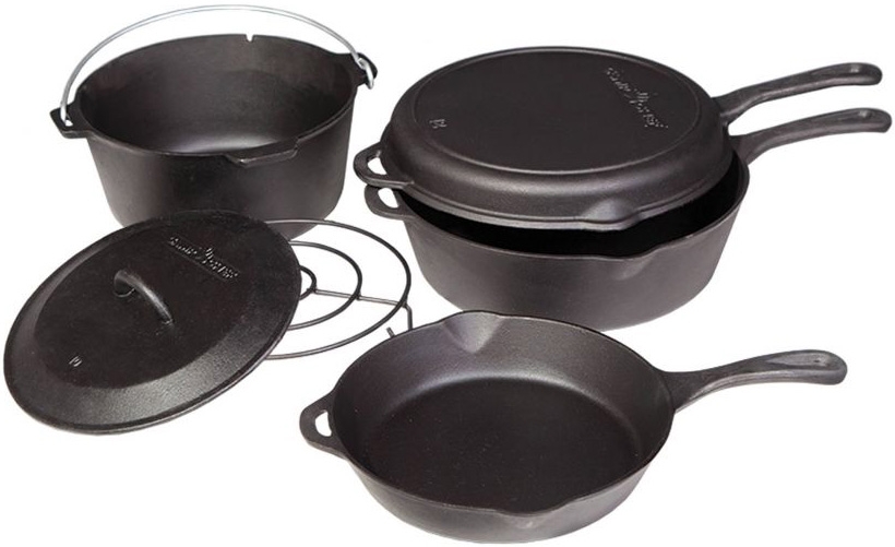 Dieses 6-teilige Gusseisen-Set von Camp Chef ist das perfekte Starterset und es besteht aus einer Zusammenstellung häufig gebrauchten Kochgeschirrs. Im Einzelnen besteht das Set aus einem 3,8 Liter Dutch Oven ohne Füße, einer 10 Zoll (25,4 cm) Pfanne und einem auf Dutch Oven und Pfanne passenden Deckel. Komplettiert wird das Set aus einer tiefen 12 Zoll (30,5 cm) Pfanne, einem passenden Deckel, der ebenfalls als Pfanne genutzt werden kann und einem Untersetzer.