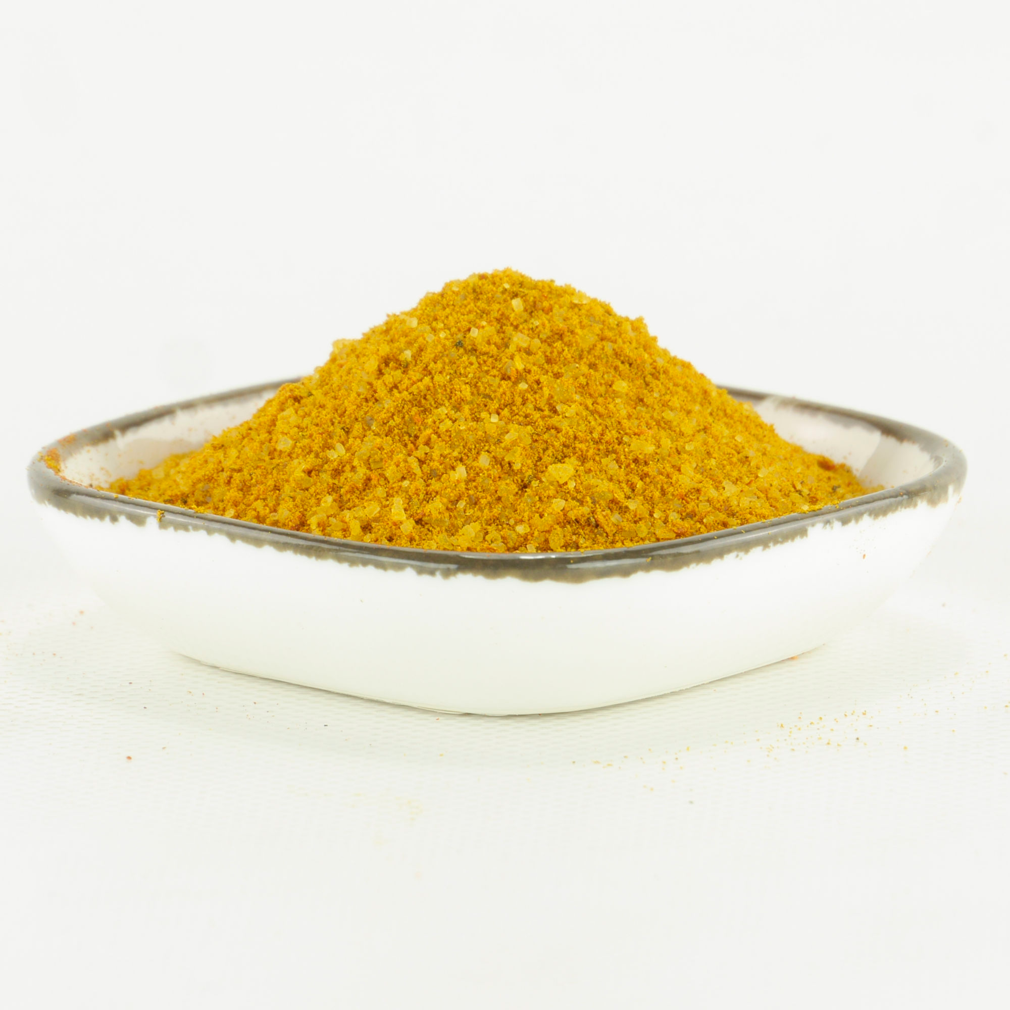 Zutaten: Meersalz, unraffinierter Rohrzucker, Curry, Curcuma, Chili, Zwiebel, Knoblauch.