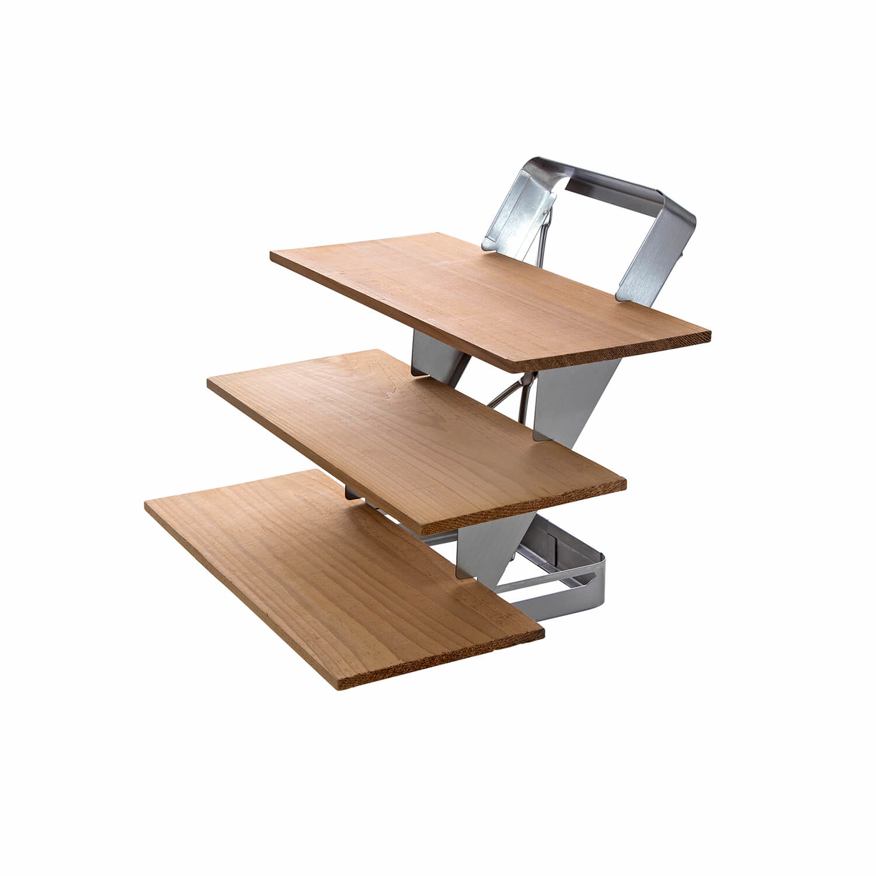 Diese Edelstahltreppe ist klappbar und wird mit Zedernholzplanken geliefert. Damit kannst du auf drei Ebenen auf Zederholz smoken und sehr platzsparend unterschiedliches Grillgut darauf platzieren. Auf der unteren Planke könntest du Geflügel unterbringen, in der Mitte wäre Platz für Lachs oder Meeresfrüchte und auf der oberen Zedernholzplanke könntest du beispielsweise Gemüse räuchern. Mit der Treppe belegst du nicht die komplette Grillfläche deines Grills und kannst dein Räuchergut platzsparend unterbringen.