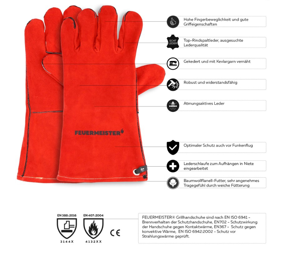 In einer perfekten Symbiose zwischen Funktionalität und Optik ist der Grillhandschuh robust und modern zugleich. Der Hitzeschutz Grillhandschuh entspricht der neuen PSA (Persönlichen Schutz Ausrüstung) Verordnung 2016/425 und wurde nach der EN 388 und der EN 407 von einem notifizierten Prüfinstitut zertifiziert. Damit steht der rote Leder Grillhandschuh für sicheres Grillen in jeder Lage. Natürlich kann der BBQ und Grillhandschuh ebenso als Kaminhandschuh, Ofenhandschuh, Backhandschuh und Kochhandschuh verwendet werden. Der FEUERMEISTER® wird geliefert als Paar in der attraktiven und auffallenden typischen FEUERMEISTER® Geschenk Verpackung mit einem Sichtfeld, um den haptischen Genuss für das Echtleder - aus gespaltener tierischer Haut unter Erhaltung der gewachsenen Fasern und ihrer natürlichen Verflechtung - des Handschuhs zu erleben.