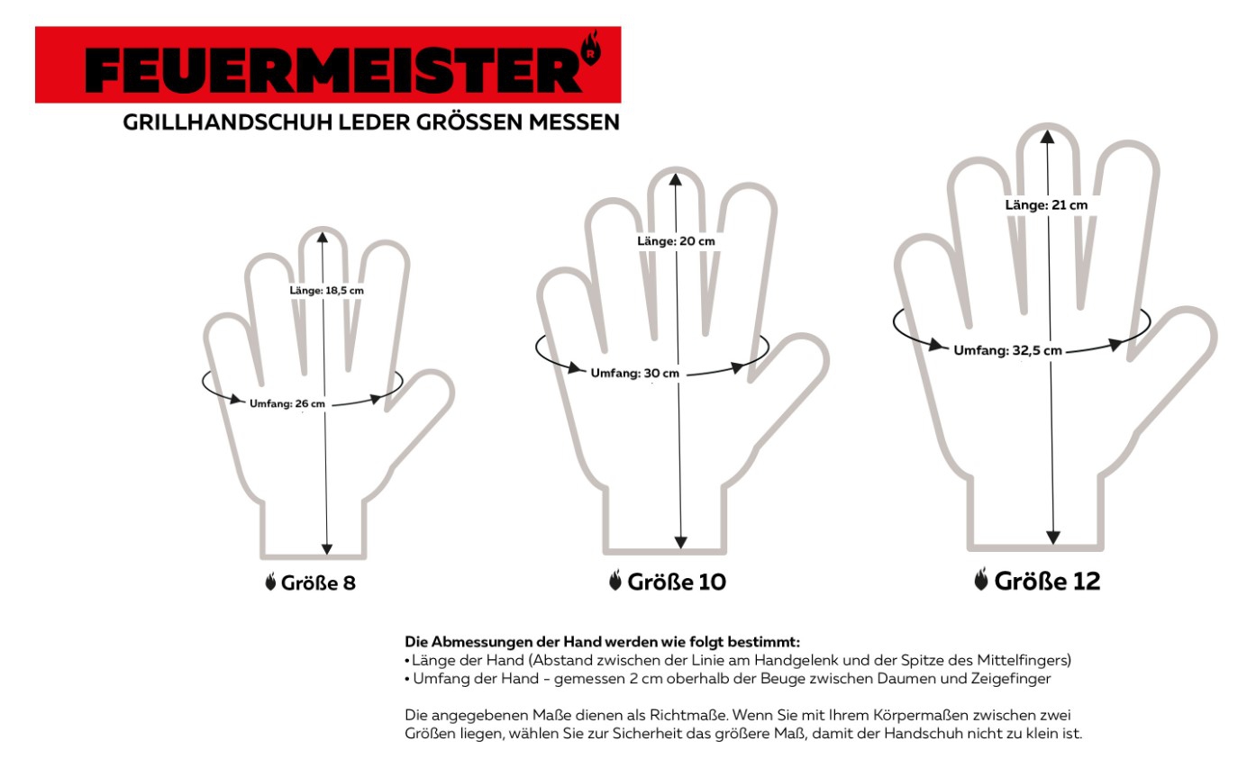 Für ein besonders gutes Tragegefühl sorgt das akkurat vernähte Innenfutter aus feinster Naturbaumwolle. Ein weiteres Highlight ist das in der extralangen und den Unterarm schützenden Stulpe eingenähte rote Innenfutter aus Baumwollköper Gewebe. Das prägnante Marken und Qualitätssiegel FEUERMEISTER® ist mit einem Thermodruck eingebrannt. Für das sichere Aufhängen des Handschuhpaares nach dem Grillen sorgt ein zusätzlich in zwei Ringösen angebrachter Lederriemen.
