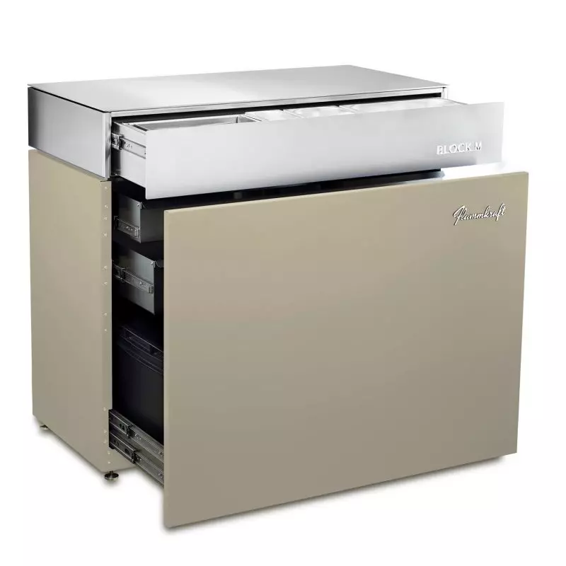 Der Block M (Gen.5) ist ein Outdoorküchenmodul aus 100% Edelstahl in der Grundfläche und in den Farben des Block D, das neben zahlreichen Aufbewahrungsmöglichkeiten für Zubehör, einen Abfallbehälter und eine komfortable Lösung für die Vorbereitung von Zutaten bietet. Auch mit seinen massiven 130 Kilogramm bleibt der Block M auf vier Schwerlastrollen mobil. Vier stabile Füße sorgen für sicheren Stand und eine optimale Ausrichtung. Innen gibt es praktische, sehr wertig gearbeitete, Schubladen und Behälter. Ein passendes Schneid- und Servierbrett ist ebenso dabei. Gekrönt wird das Außenküchenmodul von