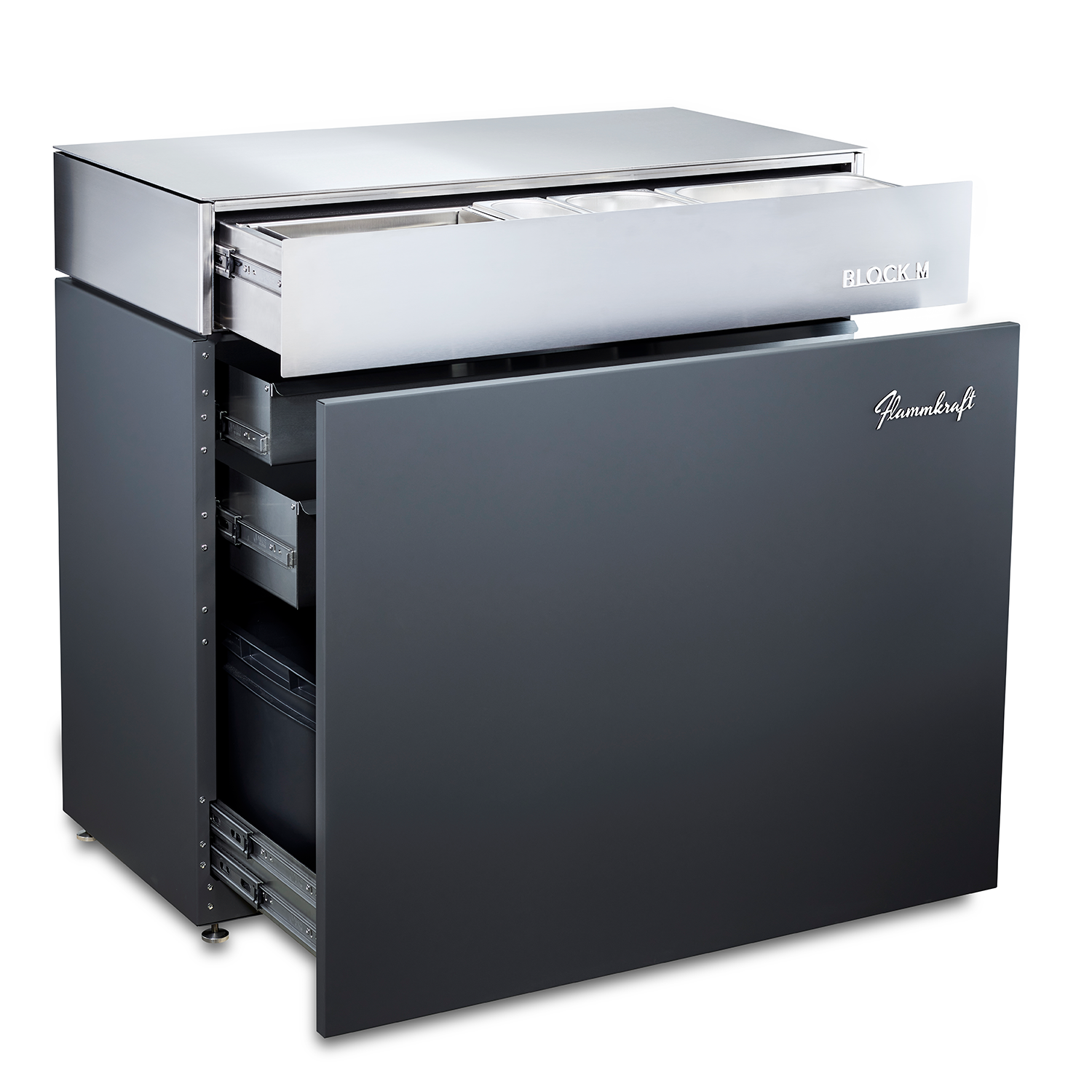 Der Block M ist ein Outdoorküchenmodul aus 100% Edelstahl in der Grundfläche und in den Farben des Block D, das neben zahlreichen Aufbewahrungsmöglichkeiten für Zubehör, einen Abfallbehälter und eine komfortable Lösung für die Vorbereitung von Zutaten bietet. Auch mit seinen massiven 130 Kilogramm bleibt der Block M auf vier Schwerlastrollen mobil. Vier stabile Füße sorgen für sicheren Stand und eine optimale Ausrichtung. Innen gibt es praktische, sehr wertig gearbeitete, Schubladen und Behälter. Ein passendes Schneid- und Servierbrett ist ebenso dabei. Gekrönt wird das Außenküchenmodul von