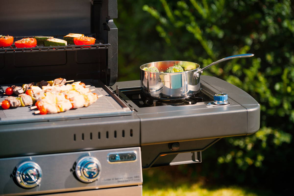 Der Seitenkocher bietet weitere Möglichkeiten, um neben dem Grillen gleichzeitig Beilagen oder Soßen zuzubereiten.