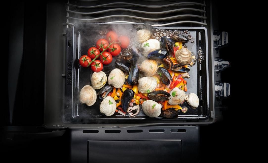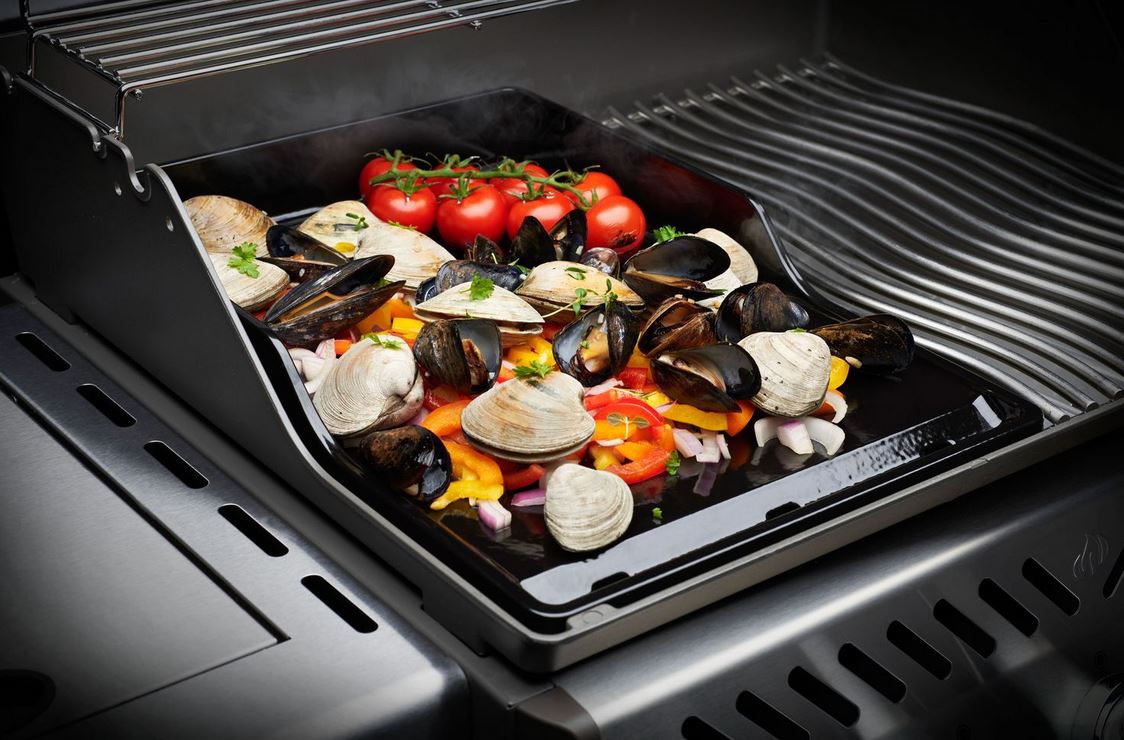 Der Napoleon Plancha bietet nicht nur für kleines Grillgut genügend Platz an, sondern auch für Fisch, Gemüse und Garnelen oder zum Frühstück Bacon und Rührei. Dein Grillgut liegt sicher auf dem porzellan-emaillierten gusseisernen Planscha und fällt durch kein Gitterrost. Das hochwertige Material nimmt die Hitze sehr gut auf und bleibt gleichmäßig vorhanden. Das Grillergebnis wird dich und deine Gäste erfreuen. Die leicht abgeschrägte Grillfläche sorgt dafür, dass Säfte und Fette in die Auffangrinne gelangen und nicht in deinen Grill. Der kleine Rand verhindert beim Wenden, dass dein Grillgut nicht doch direkt auf dem Grill landet. Die Reinigung ist schnell und einfach dank der Antihaftbeschichtung.
