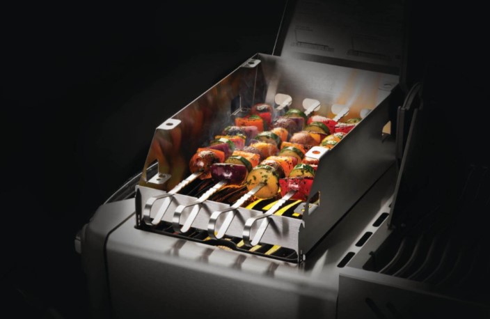 Designt für alle Modelle der Reihe Napoleon Rogue® SE-1 sowie die Grillmodelle Prestige®, Prestige PRO™ und LEX mit Infrarot SIZZLE ZONE™ Seitenbrenner. Verwenden Sie den integrierten Grillspieß-Einsatz zum Grillen von Schaschlik. Der Einsatz lässt sich bei Nichtverwendung nach unten klappen, was verhindert, dass Grillgut ins Innere des Brenners fällt, wobei dieser weiterhin zur Verwendung mit dem Hauptbrenner zur Verfügung steht. 4 Edelstahl-Spieße inklusive.