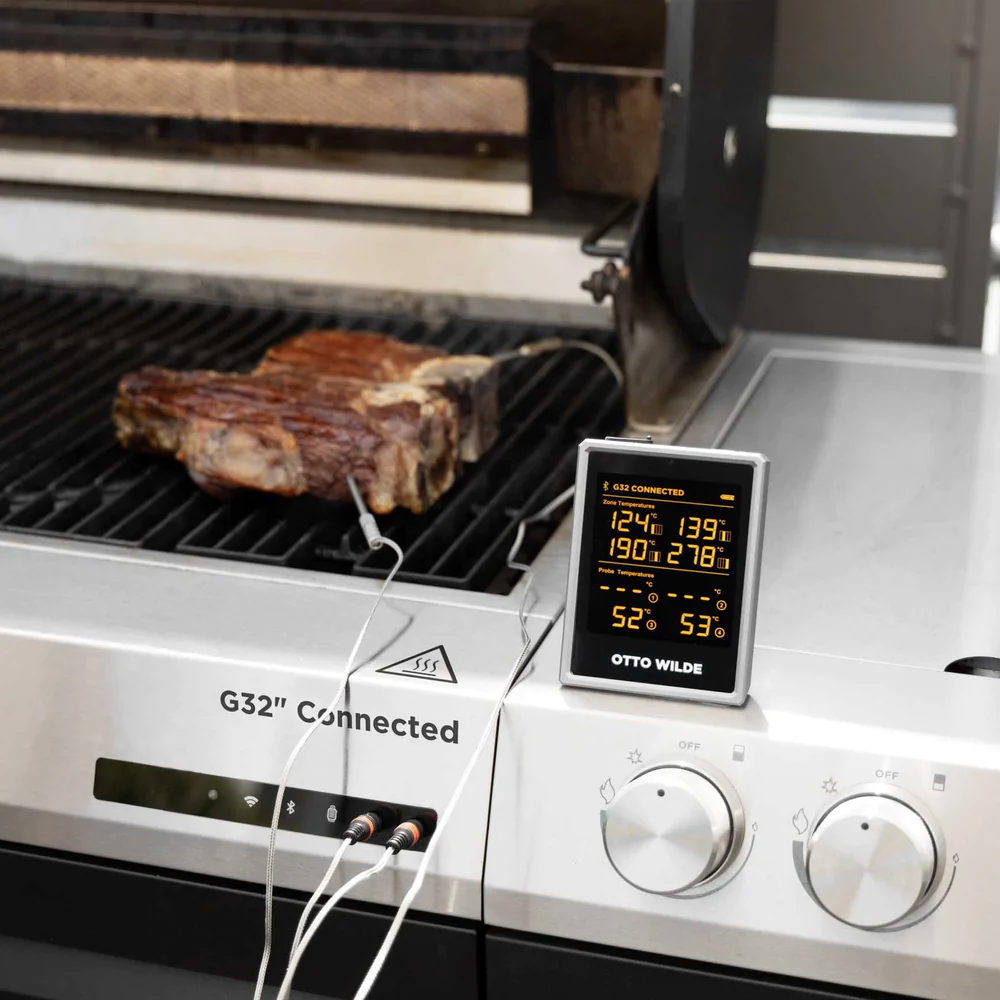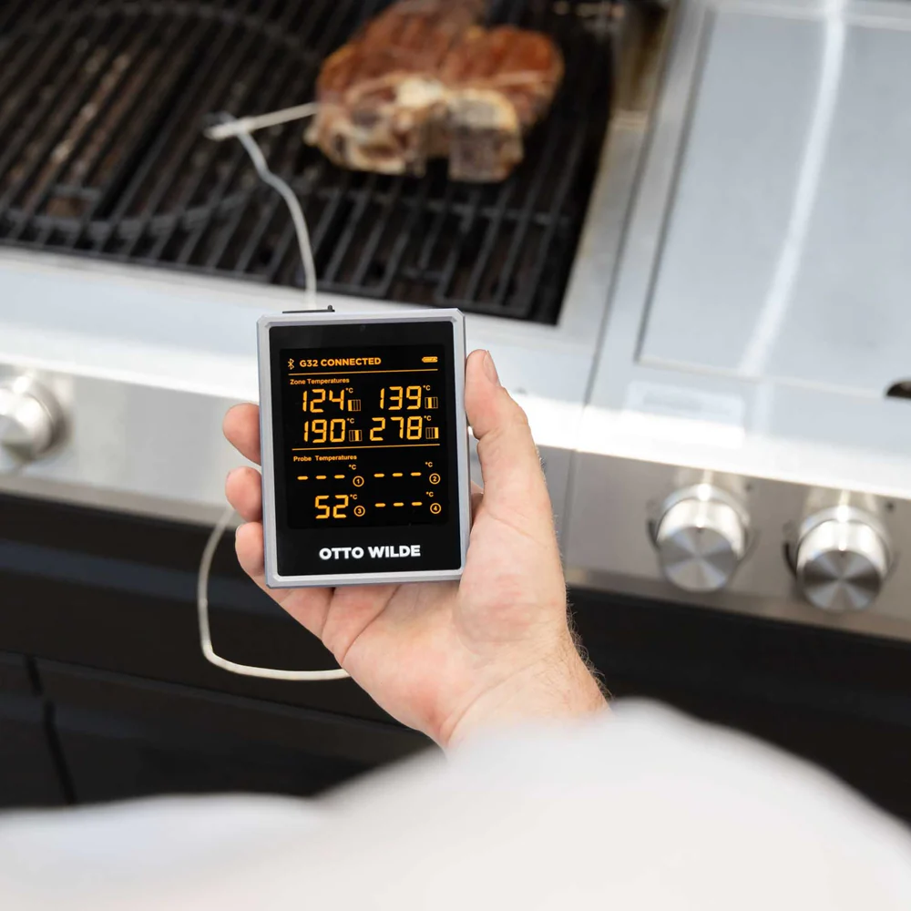Wenn du keine Lust auf die praktisch Otto Wilde App hast oder möglicherweise dein Smartphone nicht zur Verfügung steht, kannst du mit dem G32 GrillBuddy auch ohne Verbindung zur App weiter auf hohem Niveau grillen. Auf dem Display vom GrillBuddy kannst du alle Zonentemperaturen und bis zu vier Kerntemperaturfühler auf einen Blick ablesen. Auch die Füllstandsanzeige vom GasBuddy zeigt dir auf dem Display den Füllstand deiner Gasflasche an.