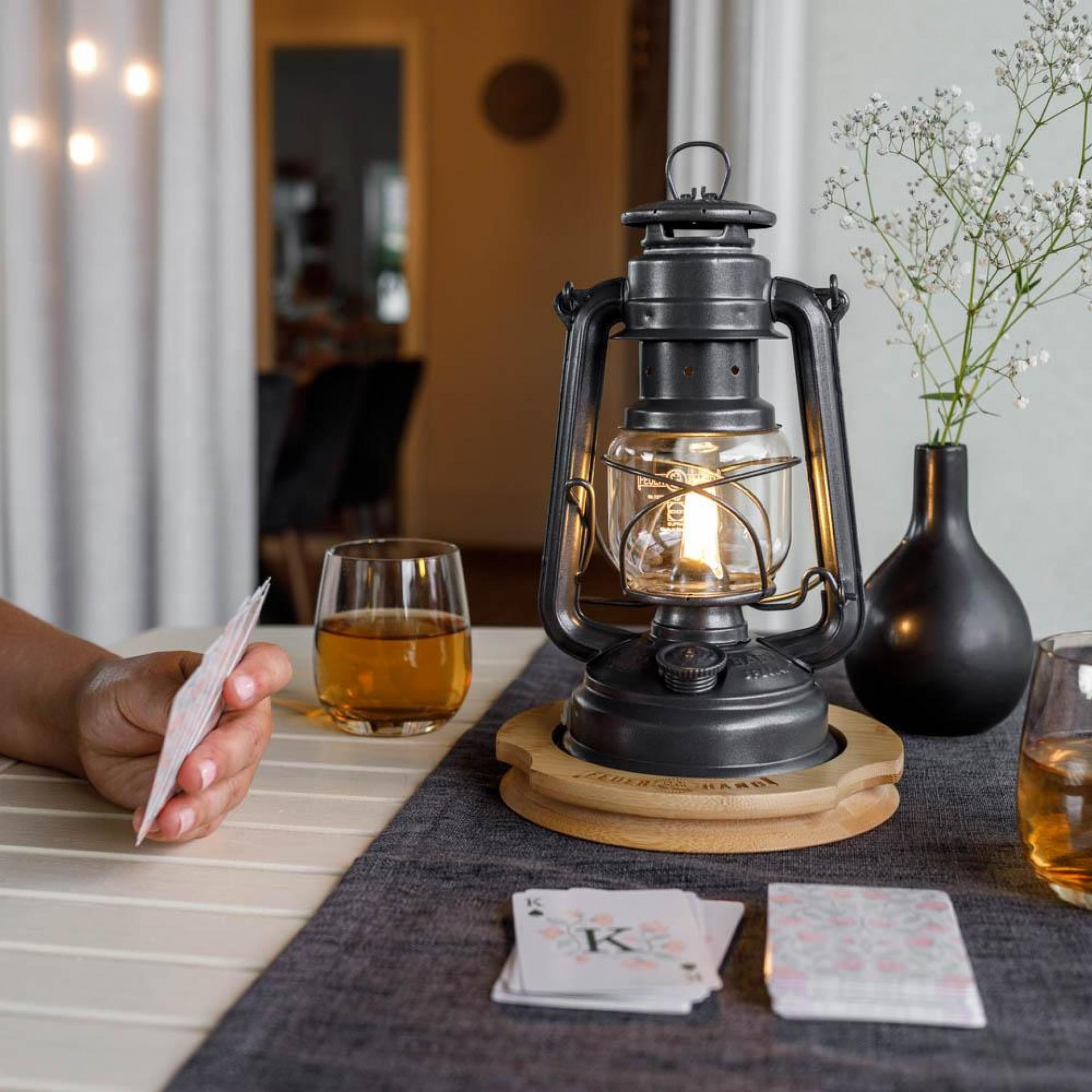 Die Feuerhand LED Laterne ist die LED-Version der seit 1893 in Deutschland hergestellten Laterne, die neue Technik mit den vertrauten Komponenten des Originals verbindet. Das warmweiße Licht ist stufenlos dimmbar und erleuchtet den Balkon, die Terrasse, den Wintergarten oder den Stellplatz auf dem Campingplatz. Die Laterne ist mit handelsüblichen Batterien oder Akkus zu bestücken und dadurch einfach zu handhaben. Sie ist aus galvanisch verzinktem Stahlblech gefertigt und wird, wie die Petroleumlaterne, ebenfalls in Hohenlockstedt produziert.