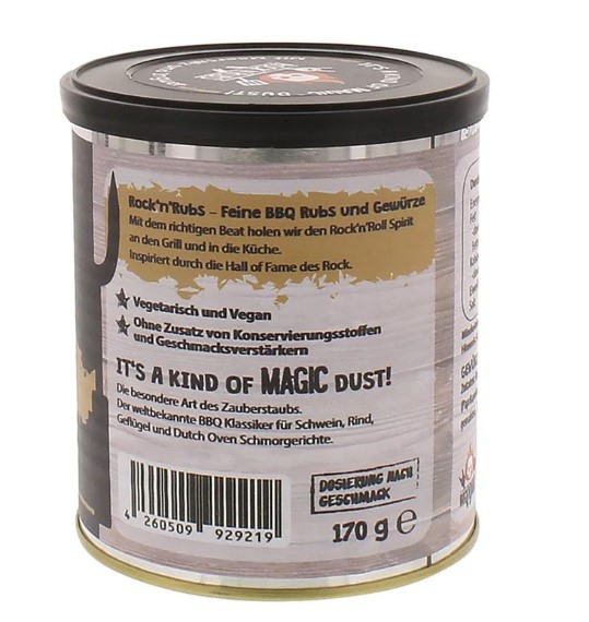 Der Rock'n'Rubs Magic Dust ist der BBQ Allrounder für Schwein, Rind, Geflügel sowie Dutch Oven Schmorgerichte. Die besondere Art des Zauberstaubs in deiner Grillküche! Verzauber deine Gäste mit einem Hauch von einem gewissen Etwas. Der weltbekannte BBQ-Klassiker!
