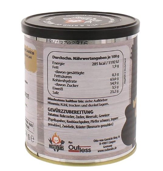 Rohrzucker, Zucker, Meersalz, Gewürze (Paprikapulver, Knoblauchpulver, Pfeffer schwarz, Ingwer gemahlen), Zwiebeln, Kräuter (Rosmarin gemahlen)