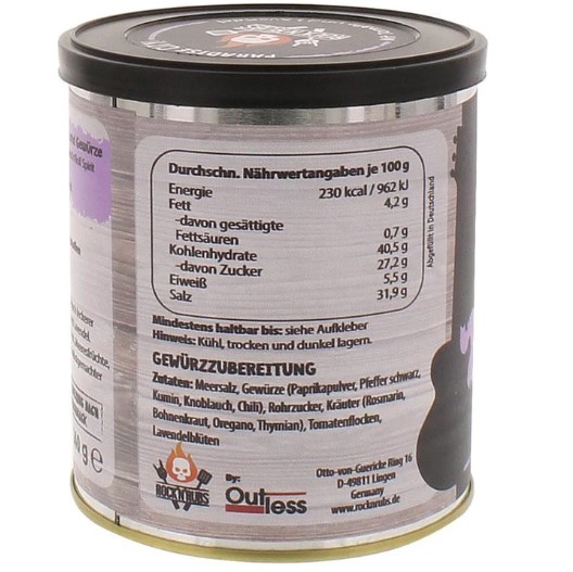 Meersalz, Gewürze (Paprikapulver, Pfeffer schwarz, Kumin, Knoblauch, Chili), Rohrzucker, Kräuter (Rosmarin, Bohnenkraut, Oregano, Thymian), Tomatenflocken, Lavendelblüten