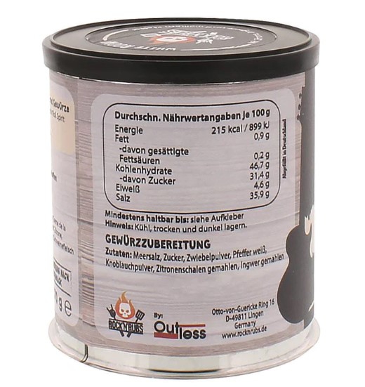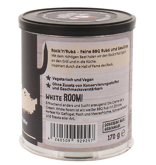 Der Rock'n'Rubs White Room ist ein weißer BBQ Rub mit Zitrone, weißem Pfeffer, Knoblauch, Zwiebel und Ingwer Perfekt für Geflügel, Fisch und Seafood, Schweinefleisch und Steaks aller Art. Erfrischend anders und Sucht erzeugend! Die Crème de la Cream!