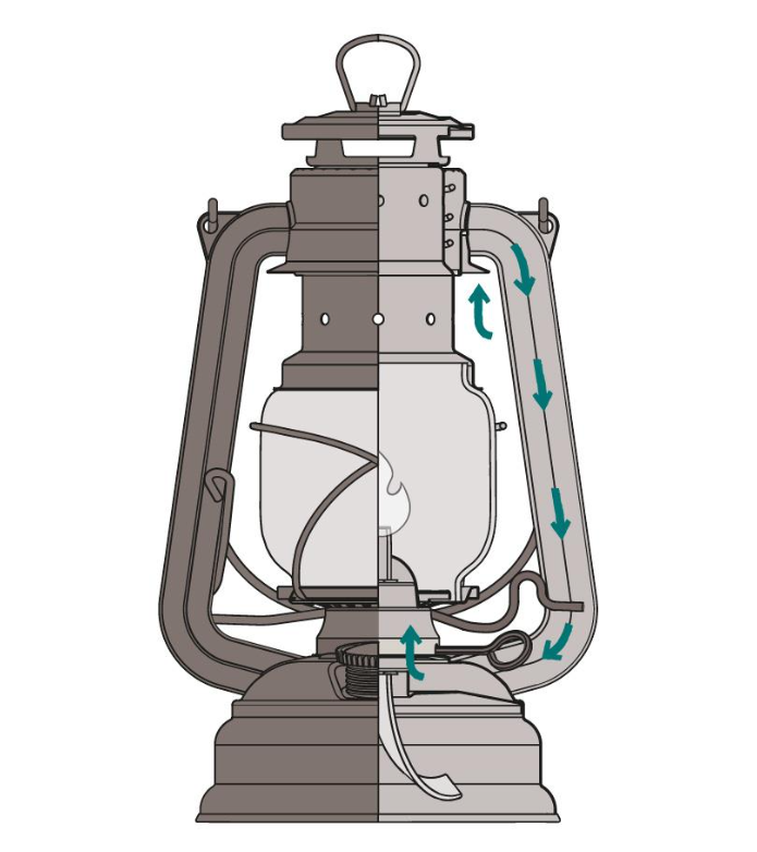Dank der ausgeklügelten Bauweise der Petroleumlampen, ist der Verbrauch von Petroleum erst etwa nach 20 Stunden Brenndauer gegeben. Die Flamme ist durch den Glaszylinder vor Wind geschützt und daher brennt gleichmäßig und stetig ab.