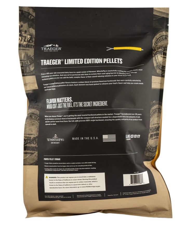 Traeger hat sich mit der Crew von WhistlePig Whiskey aus Vermont zusammengetan, um diese limitierten Traeger Whiskey Barrel Pellets zu kreieren. Diese Pellets bestehen aus einer Mischung aus gebrauchten WhistlePig-Whisky-Stäben und rein natürlichem Hartholz und verleihen Ihrem holzbefeuerten Essen einen Hauch von reichhaltigem, im Fass gereiftem Whisky-Geschmack.