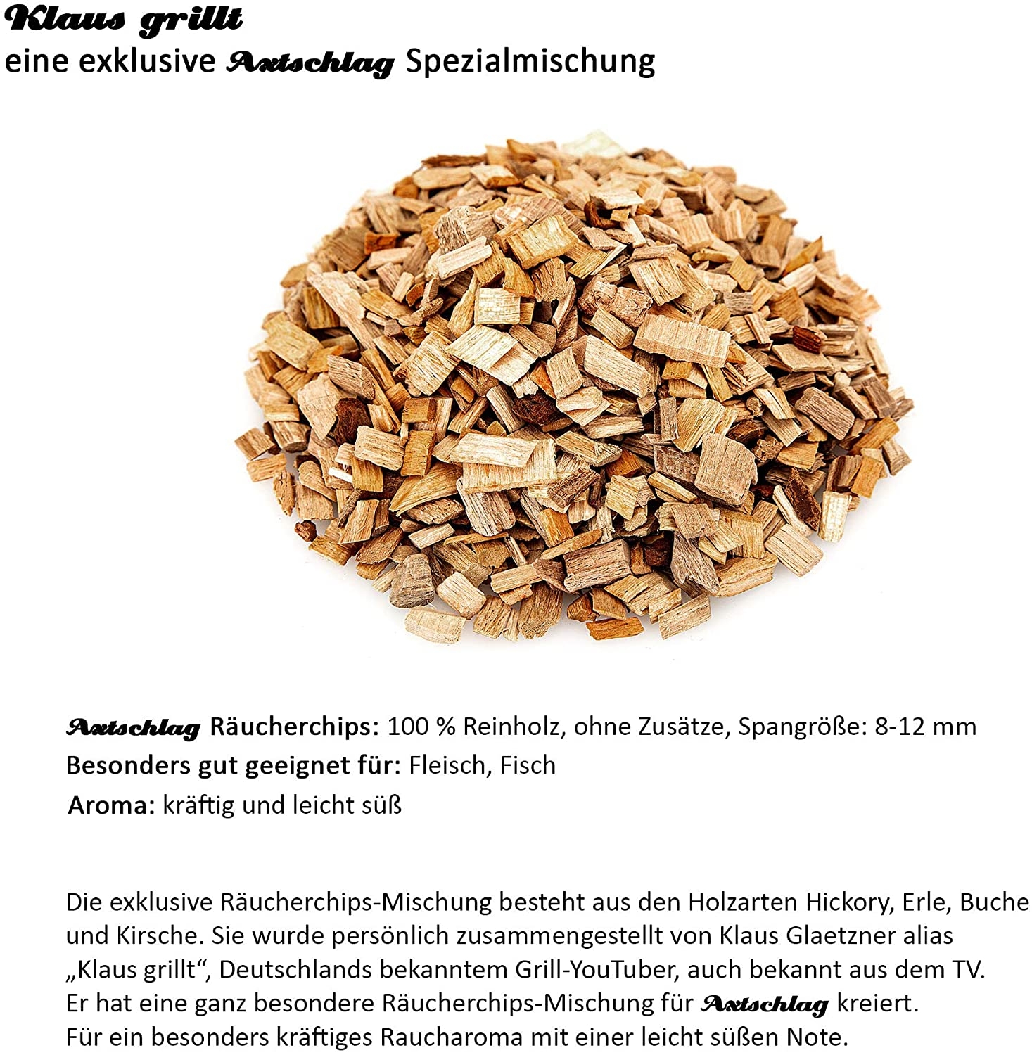 Aus 100 % Reinholz wurde der exklusive Räucherchips Mix von Grill - You Tuber "Klaus Grillt" zusammengestellt und besteht aus Buchenholz, Erlenholz, Kirschholz und Hickory Holz.